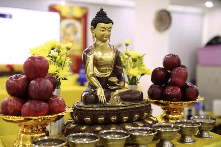 After drinking the tea, they stand up in front of the Buddha statue with hands putting together to make auspicious prayer to the Three Jewels and mighty Dharma protectors.